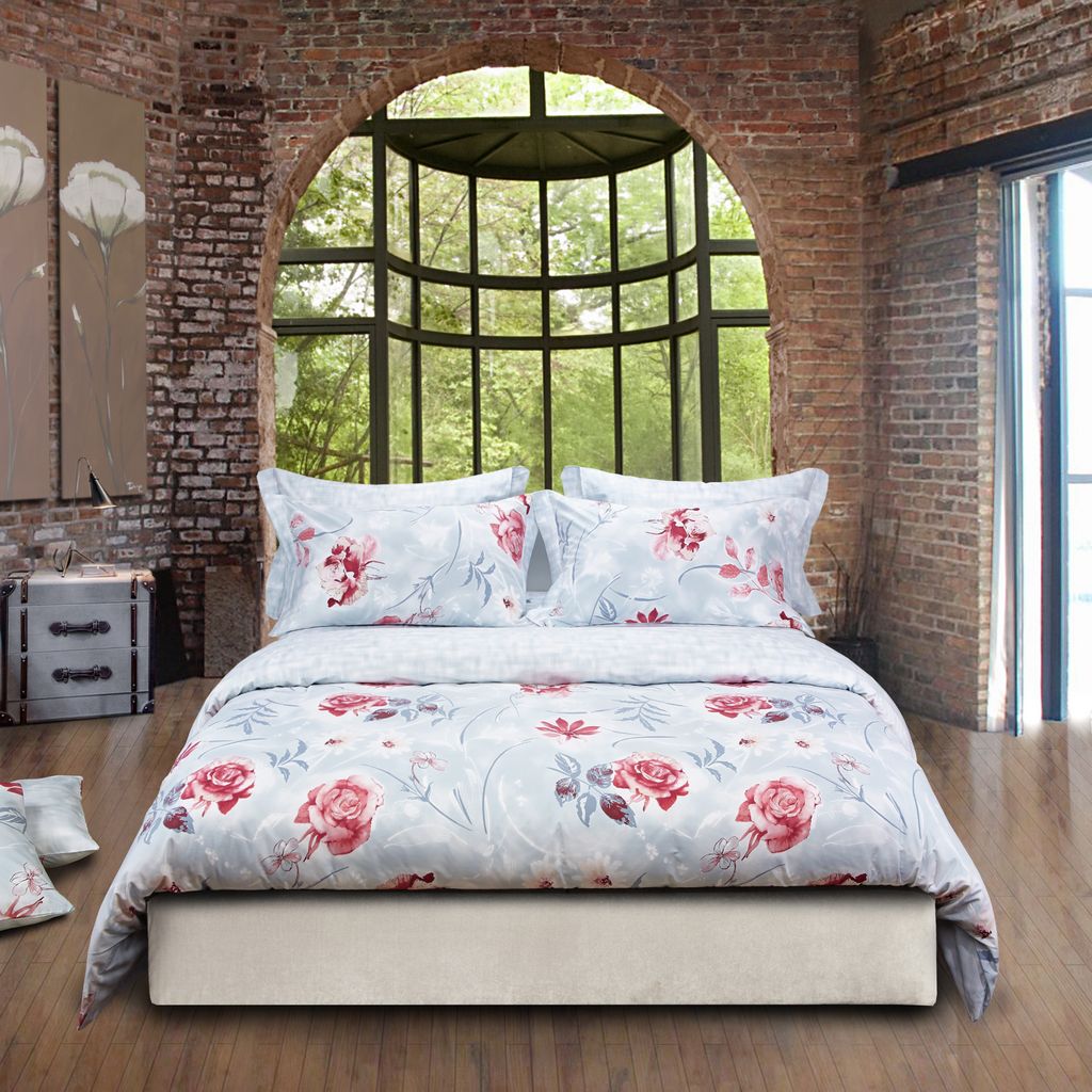 Completo letto matrimoniale in puro cotone 100%, stampa floreale, federe a 2 volant laterali.