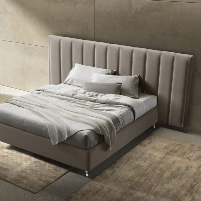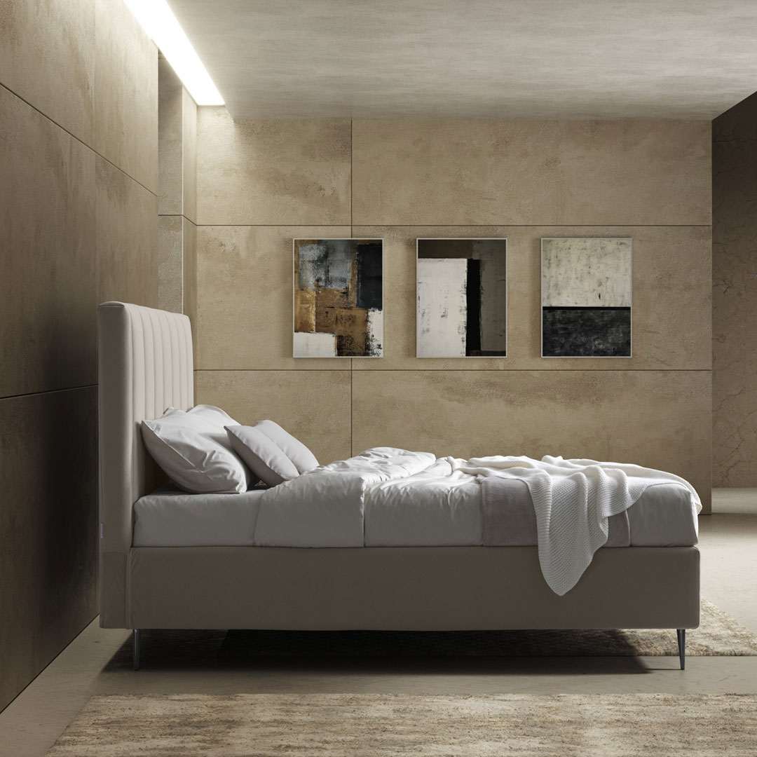 È un letto con una testata dallo spessore importante, realizzata con una particolare lavorazione di trapuntatura a fasce larghe verticali che ne risalta il rigore e la pulizia delle linee. Può essere rivestita con molteplici tipologie di rivestimento che trasmettono sensazioni differenti al tatto.